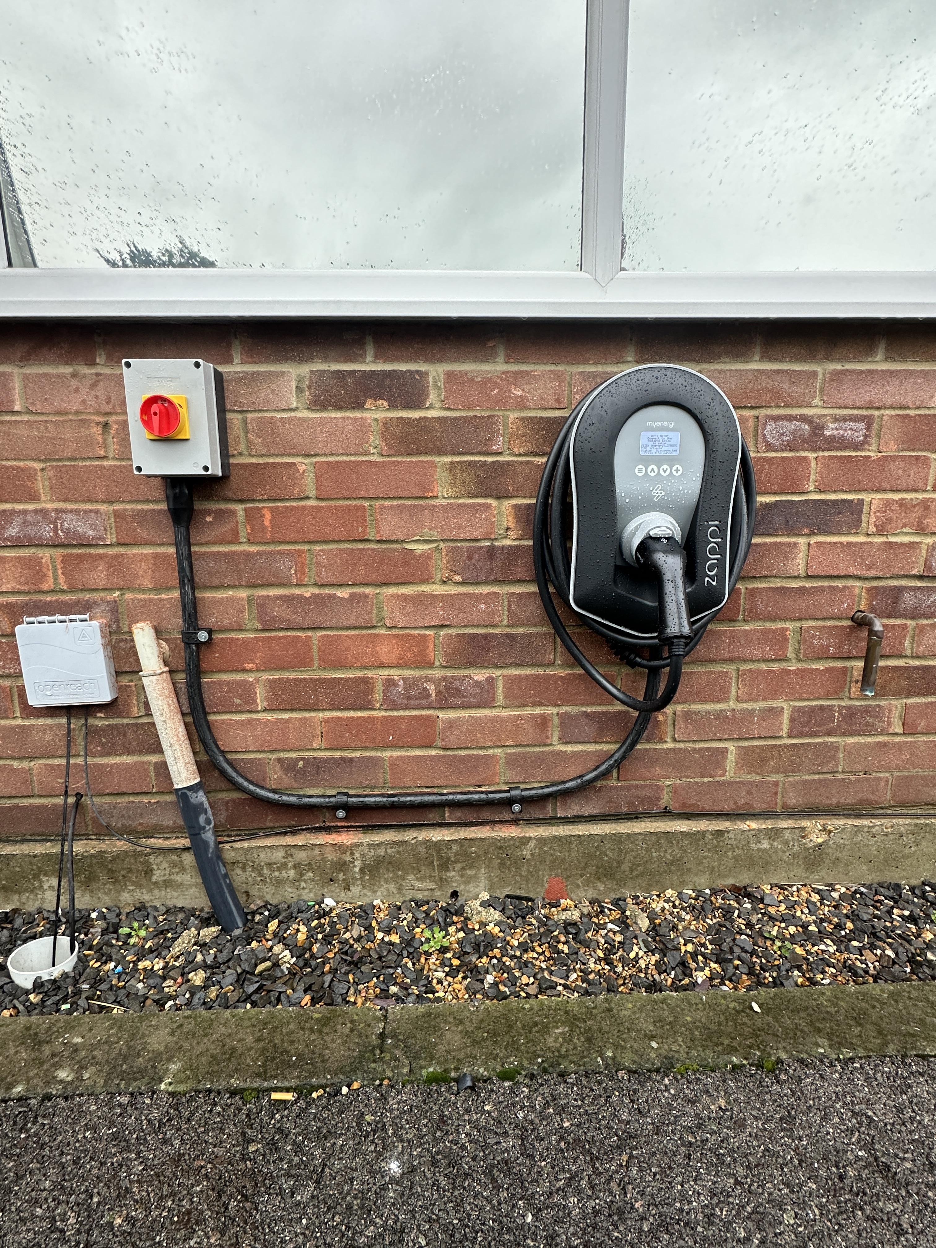 A clearly labelled local isolator was installed adjacent to the charger. This allows safe isolation for maintenance or emergency situations and is a standard requirement on commercial sites.